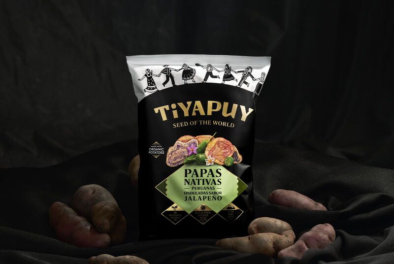 Papas nativas mixtas (Sumac soncco, Qeqorani, Huayro macho, Cacho de toro) en hojuelas onduladas, fritas en aceite de girasol alto oleico y saborizadas con mezcla a base de jalapeño y especias naturales. 48 piezas por caja.